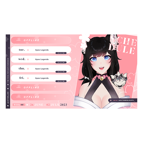 Pieces not listed are usually made by me; Ex: Twitter Banner, Pinned Schedule, Stinger, Logo, BRB Screens